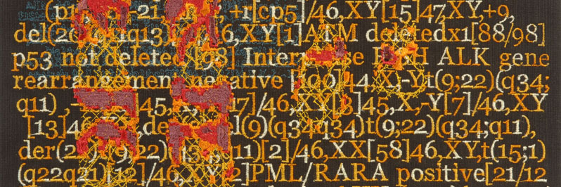 Karina Thompson has been working within studio textiles for over 20 years. Through a link with VSM (UK) ltd and Pfaff sewing machines she has recently been experimenting with digitally programmed stitch. This new work is an examination of the way that digital technology is used in the treatment and diagnosis of illness. By programming in advance with a computer she is able to use stitch with pin point accuracy and in ways she could only have dreamt of when she first started.