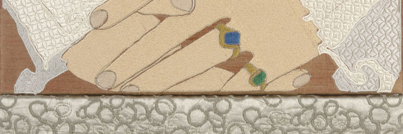 Karina Thompson has been working within studio textiles for over 20 years. Through a link with VSM (UK) ltd and Pfaff sewing machines she has recently been experimenting with digitally programmed stitch. This new work is an examination of the way that digital technology is used in the treatment and diagnosis of illness. By programming in advance with a computer she is able to use stitch with pin point accuracy and in ways she could only have dreamt of when she first started.